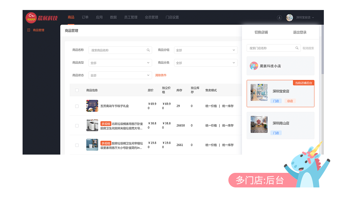 2.统一管理店长、商品,可随时查看各个门店销售数据
