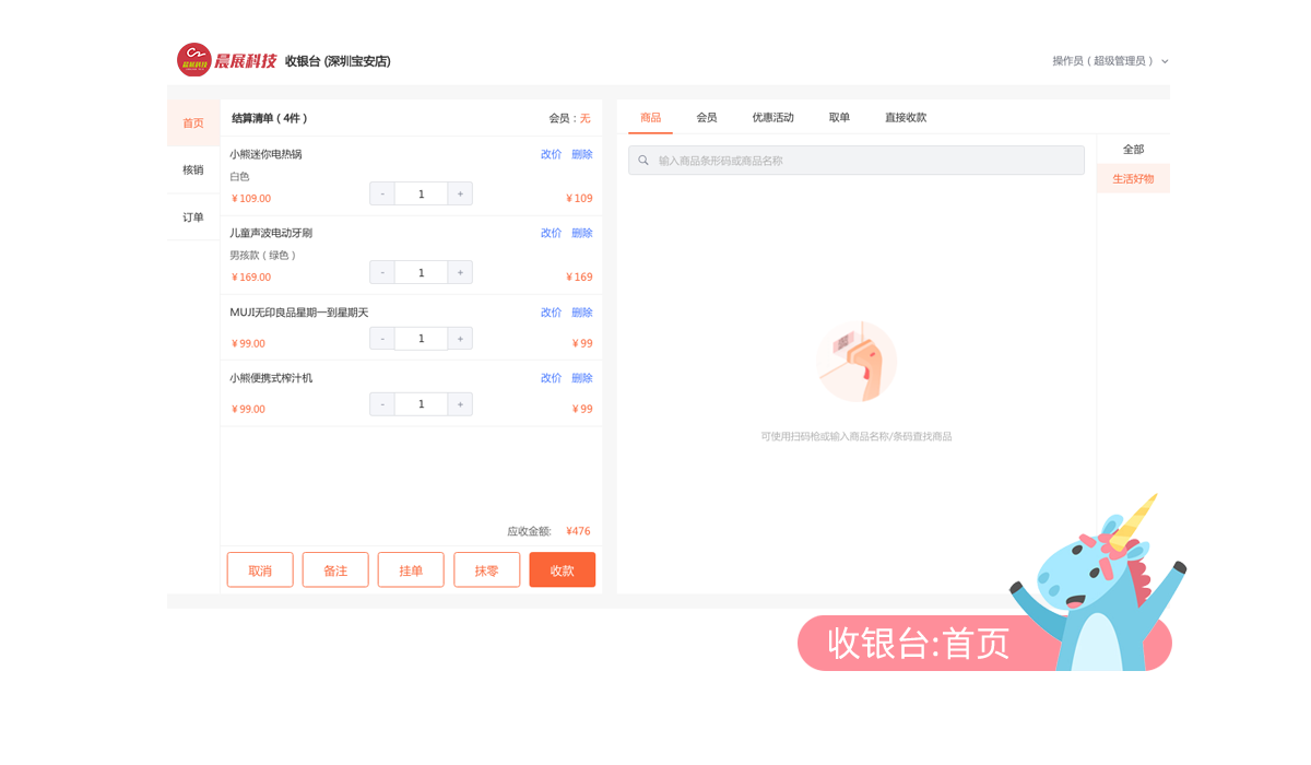 收银台对接扫码枪,可通过搜索、扫码、手动选择等方式查找目标商品