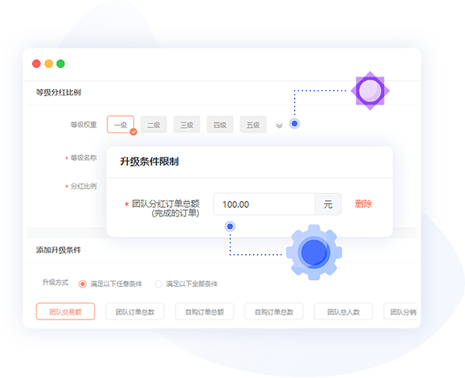 等级分红比例,升级条件及升级限制灵活设置,打造有规则的团队分红战略