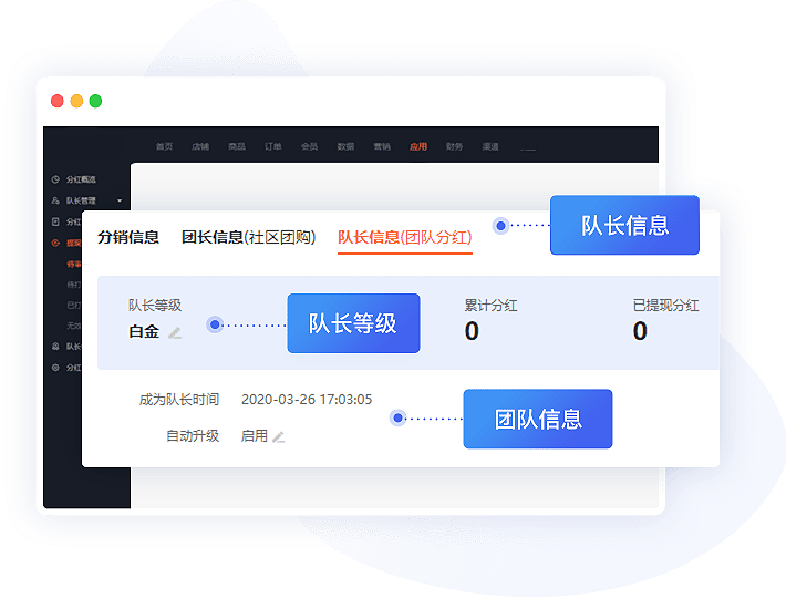 分销商和普通用户都可以成为队员 队员成为队长后,将和其下队员独立成团