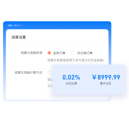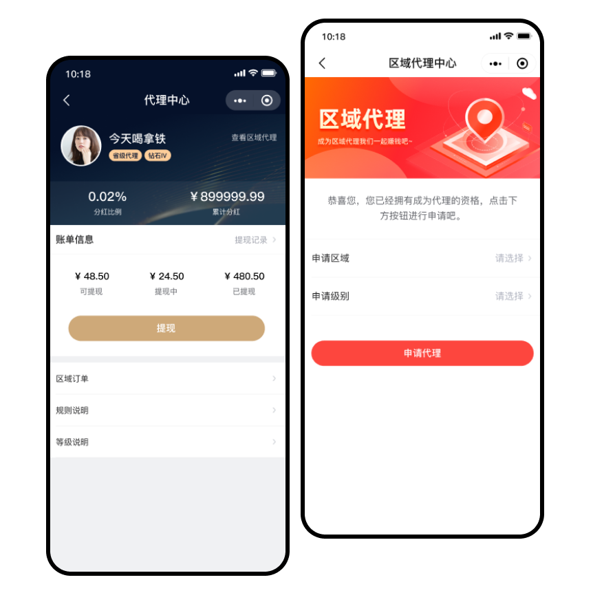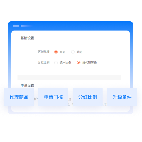 自定义代理商品、申请门槛、分红比例、升级条件、代理中心等相关设置,打造个性化的区域代理体系