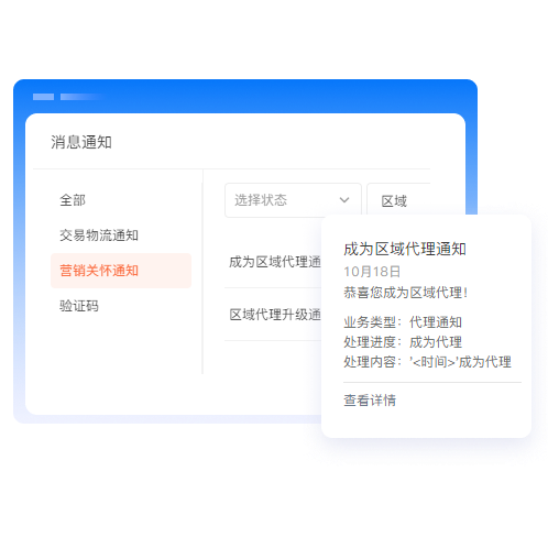 当后台发出成为代理、代理升级、分红入账、分红体现申请驳回、分红提现打款、代理撤销等通知时,会在微信模板或短信中收到消息