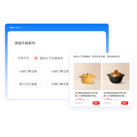 需满足设定的订单数、销售额、下线人数、下线分销商等条件后即可升级,可根据自身需求灵活设置