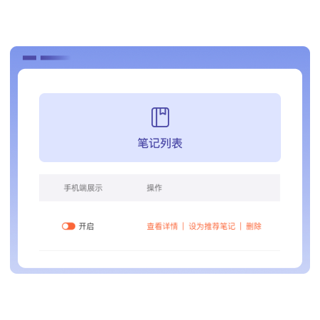 商家可在后台查看所有笔记的点赞、收藏、评论、投诉等相关信息数据,商家可手动将笔记设置为“推荐笔记”以及是否在“手机端展示”