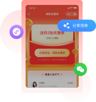 可自定义优惠券名称、券值面额、消费门槛、第N个领N元、赠送条件、领取次数、分享图片和文案等,实现个性化裂变营销。