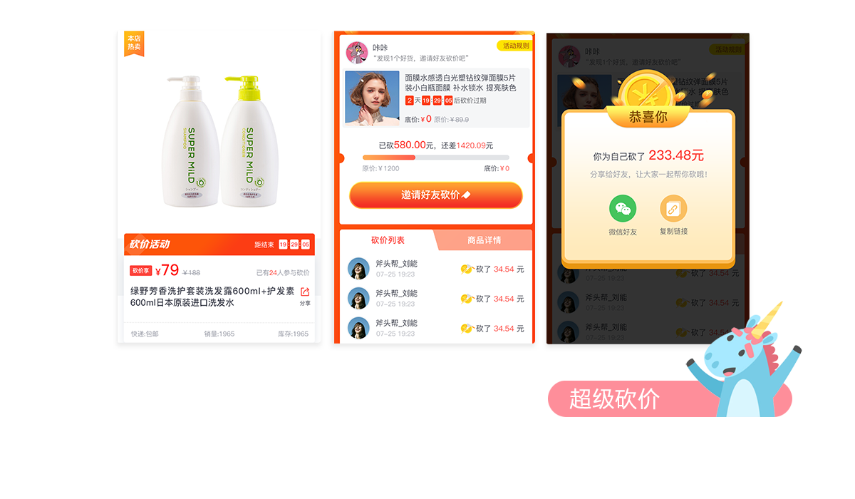“砍价免费拿”成功吸引用户关注,持续拉新并在微信生态内获得流量,砍价功能助力活动信息快速传播,有效获取目标用户