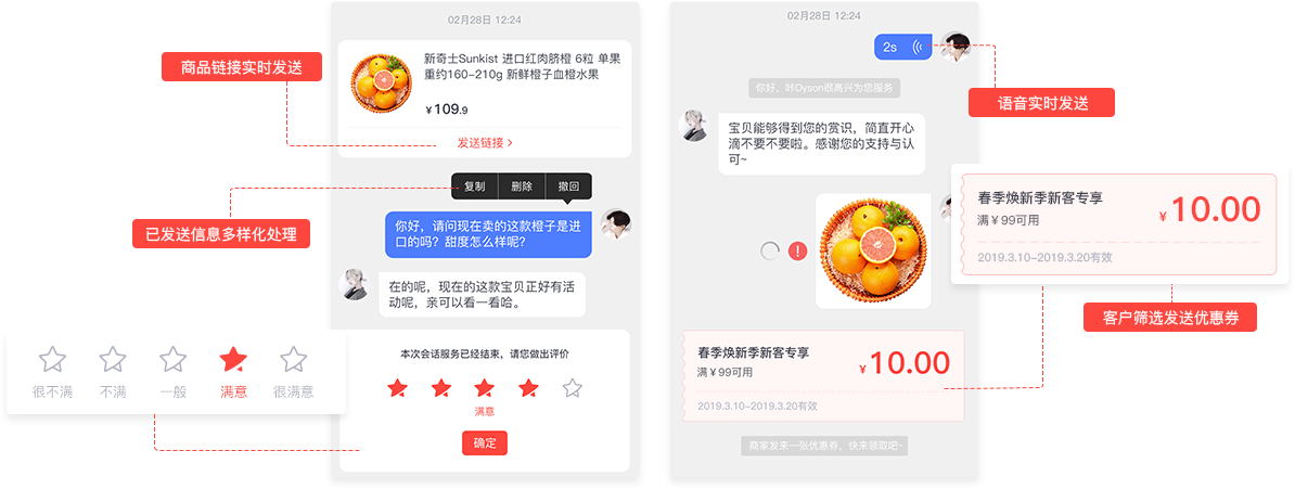 可支持文字、图片、语音、商品、订单、优惠券、二维码等对话方式,满足用户和客服之间多样化沟通需求